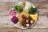台湾で人気のスパイス・五香粉が心地良く香る大豆ミートそぼろをかけたベジミートヌードルに、ケールとニラのマリネ、レンコンと白きくらげのマリネ、紅芯大根、みょうが、デュカナッツなど野菜をたっぷりのせたベジサラダプレート。ノンミートで、近年増えているフレキシタリアン(植物性中心だが、時々肉・魚も食べる方)などの方にむけた商品です。